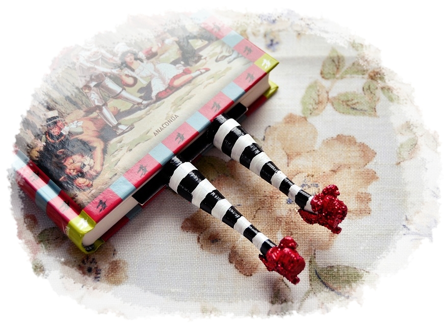 Espere que as pernas e os sapatinhos sequem. E prontinho, com a cola se preferir e sentir mais segurança cole os pés nos sapatinhos. Depois encaixe o marcador ou papel cartão nas pernas (percebam que na foto a Urora fez um cortezinho pra encaixar o marcador em ambas das pernas).