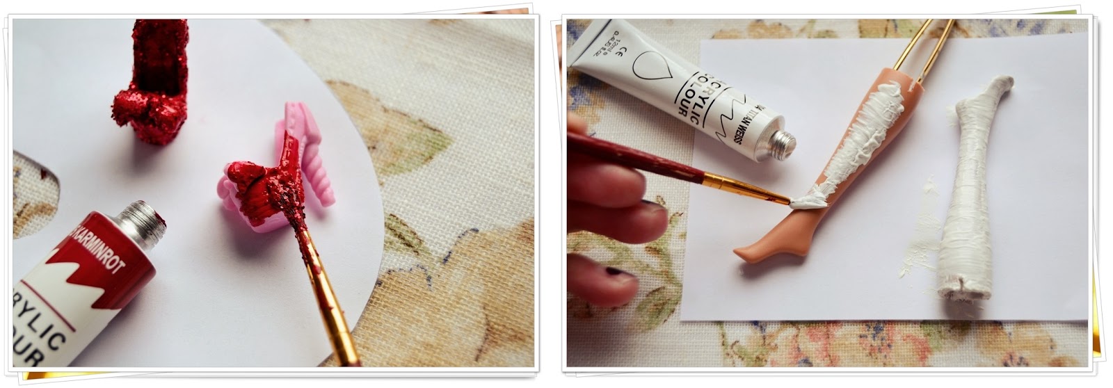 Com a tinta vermelha pinte o sapatinho já as pernas, pinte de branco por completo e em seguida com a tinta preta faça listras grossas na perna: