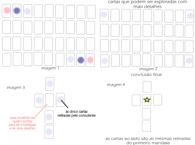 9. Se a consulente quiser , monte um mandala, pondo no meio o assunto que será pesquisado com mais detalhe. Depois, pede-se para que o consulente tire cinco cartas do baralho que serão postas desta maneira. (imagem 3)